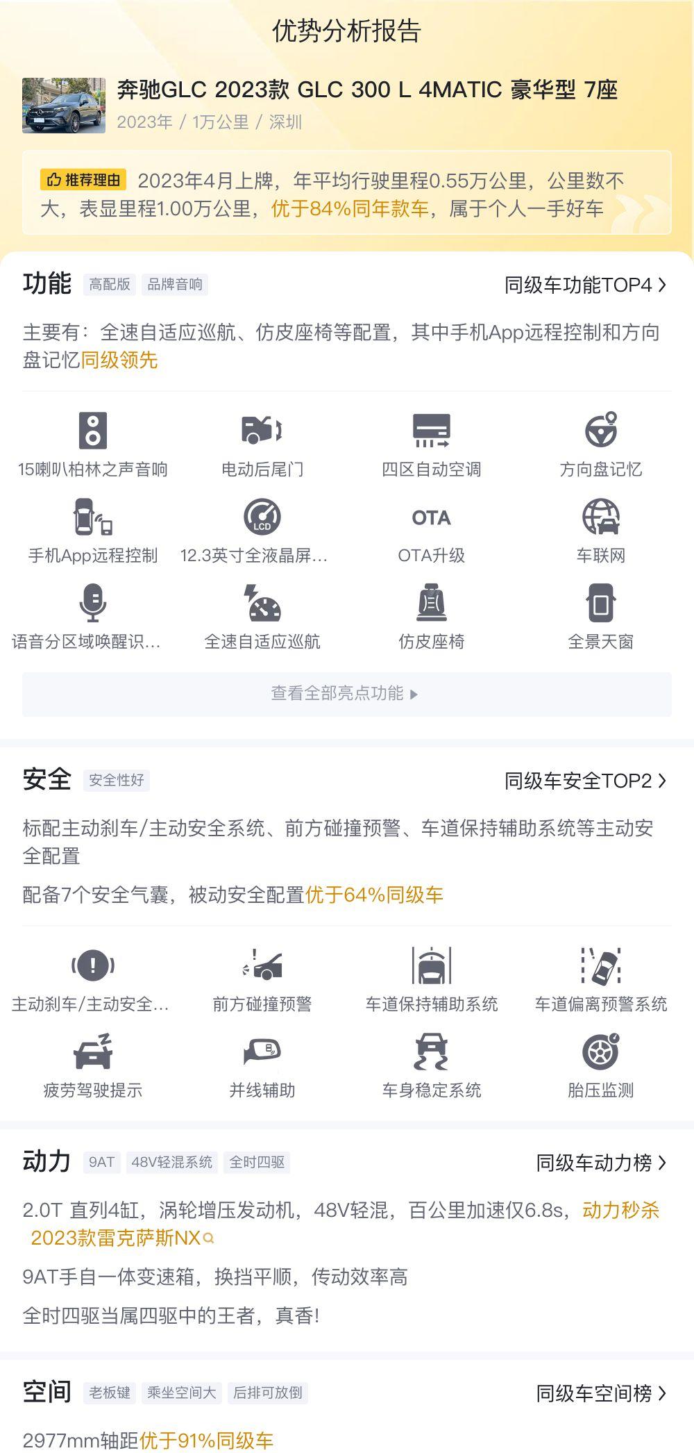 当然,买二手车不仅仅要看价格和配置,还要考虑后期的用车成本。根据估算,这辆GLC 300 L 的年均用车成本大约在1.9万元左右,包括燃油费、保养费、保险费等等。这个数字可能会因为个人的用车习惯和地区差异而有所波动,但总体来说,对于一辆豪华SUV而言,这个用车成本还是比较合理的。