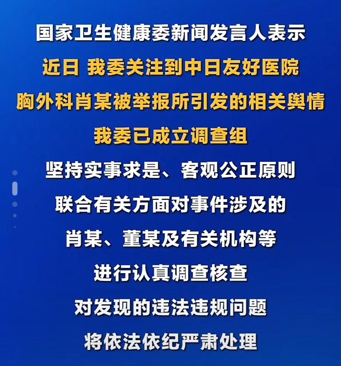 国家卫生健康委员会(以下简称“国家卫健委”)近日针对中日友好医院两名医务人员——肖某与董某涉嫌违反职业规范的问题展开调查。此事引发医疗行业及社会广泛关注,相关部门强调将依法依规严肃处理,维护医疗系统公信力。