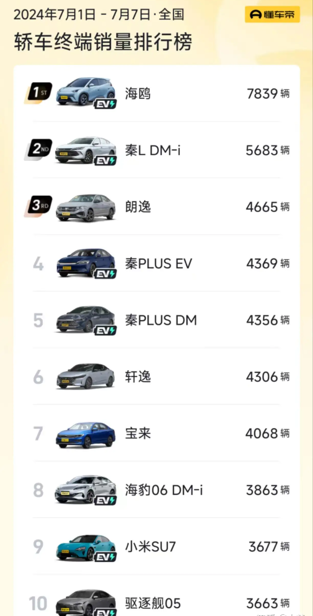 上周的销量数据显示,在不加任何限定词的榜单中,小米汽车已经跻身前十。在纯电动轿车榜单中更是名列第五,成为市场上的一匹黑马。