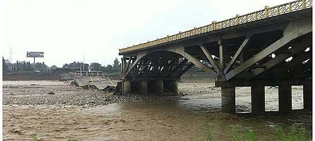 由于开工前没有实地勘测,连续的降雨天气导致大桥基座软化所,桥头段明显下沉。