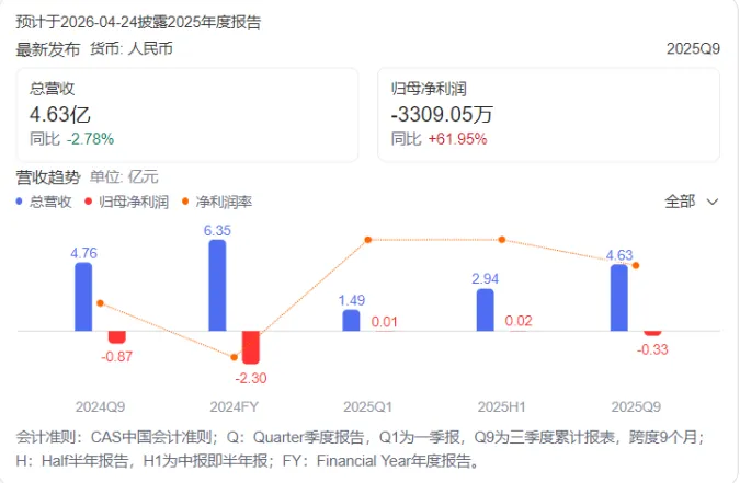不过,在2025年,麦趣尔出现了持续性的业绩改良。财报数据显示,2025年Q1-Q3,麦趣尔归母净利润分别增长102.2%、102.4%、61.95%。不过,2025年Q3,麦趣尔仍处在亏损状态,其2025年Q3归母净利润为-0.33亿元。