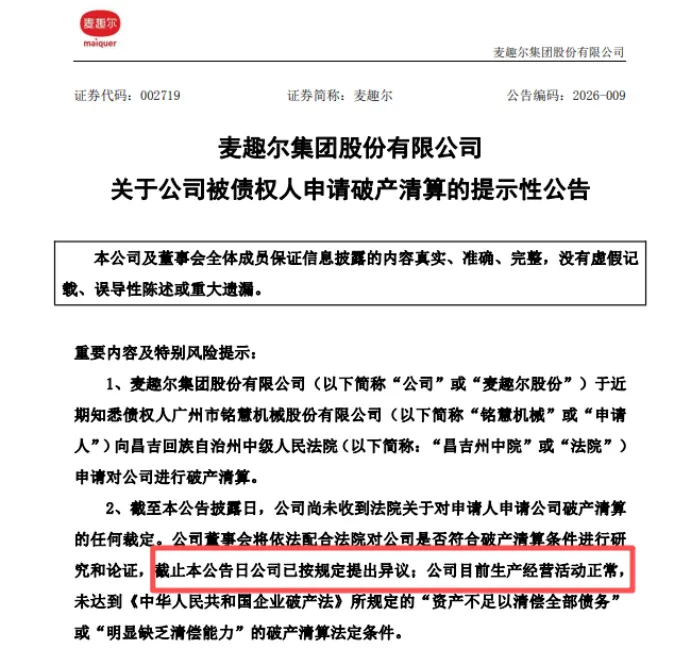 麦趣尔方面回应表示,截至公告披露日,公司已按规定提出异议,公司目前生产经营活动正常,未达到《中华人民共和国企业破产法》所规定的“资产不足以清偿全部债务”或“明显缺乏清偿能力”的破产清算法定条件。