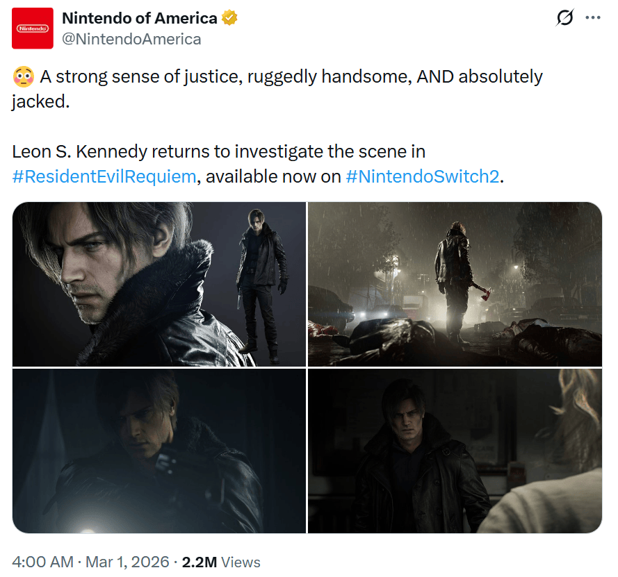 尽管这是在宣传NS2版《生化危机9》,却同样证明了没人能够抗拒里昂的魅力,这对于生存恐怖品类的3A单机而言实属罕见。可见优质的角色塑造,能够打破游戏品类壁垒,弱化核心向作品的圈层门槛,实现IP影响力的全域扩散,这也是卡普空角色运营策略的核心优势。