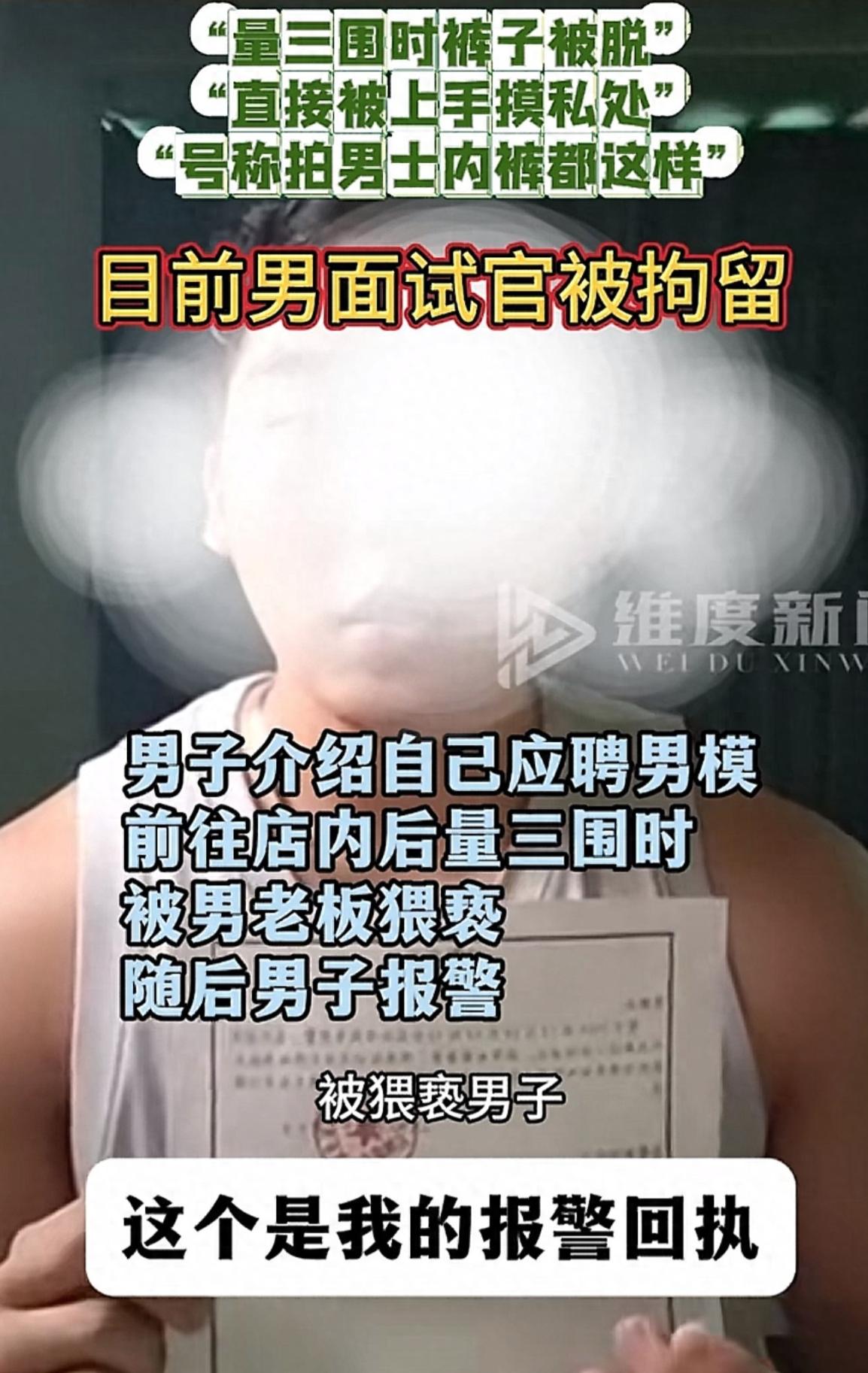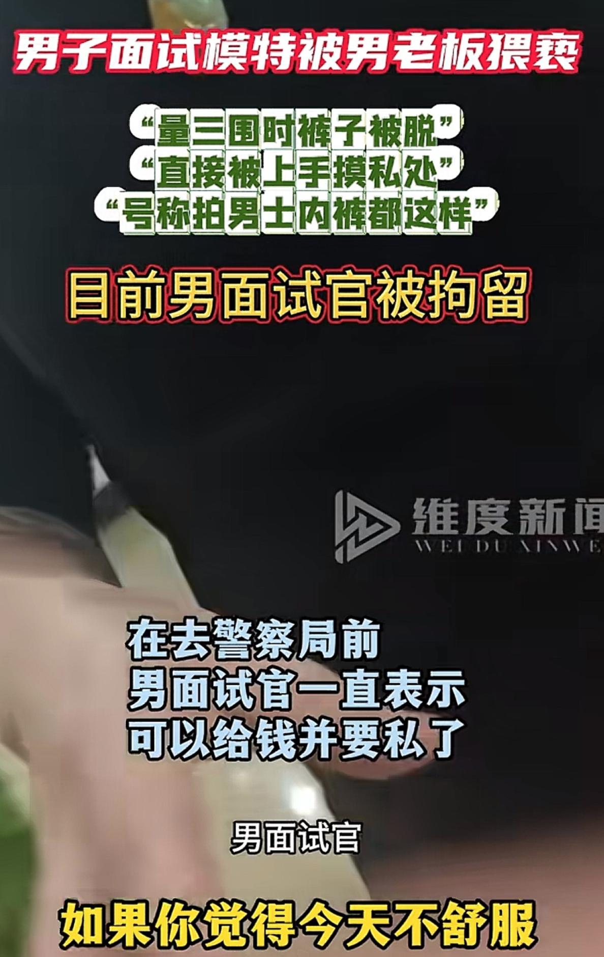 按照面试流程,男老板要求为男子测量“三围”尺寸,这本是模特行业正常的环节。然而,事情却逐渐变得不对劲。