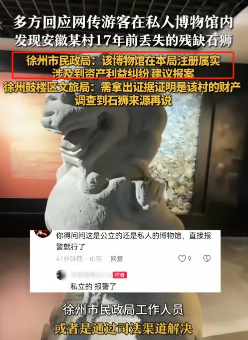 随着事件的发酵,徐州的文旅部门也做出了回应,他们认为,要证明这个石狮子是他们村的,需要同村的人拿出相关的证据,得证明是村里的财产才行。