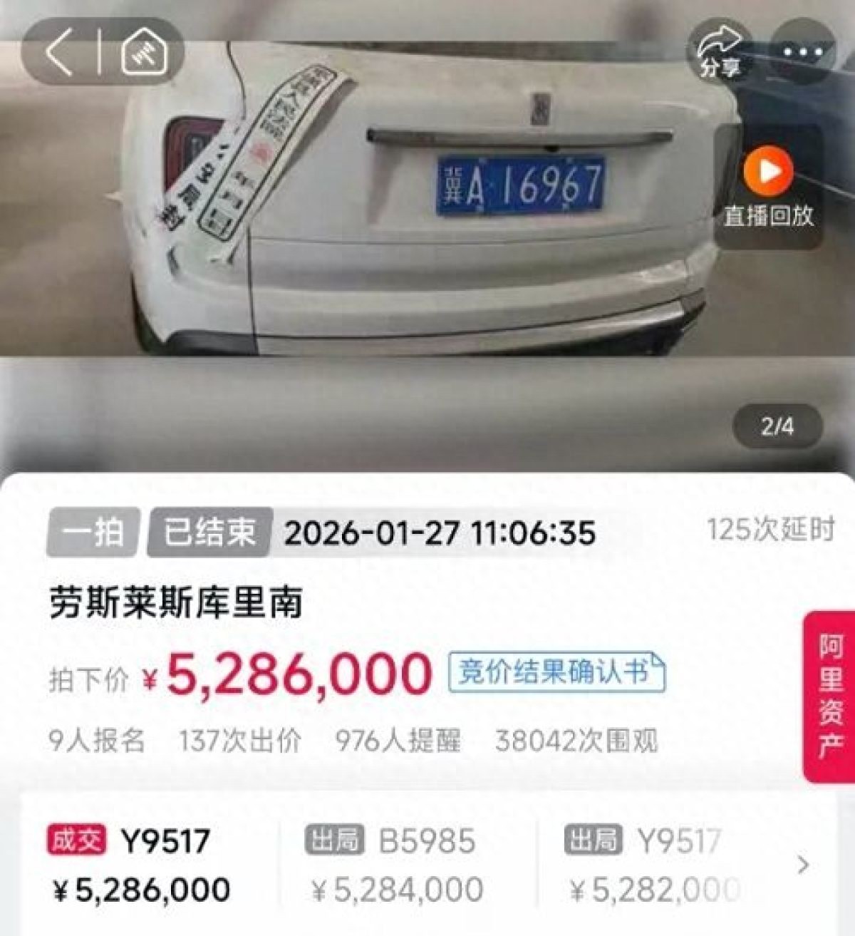 1月27日上午,大皖新闻记者从阿里资产平台看到,一辆涉刑资产劳斯莱斯库里南拍卖结束,起拍价471万元,经过137次出价,最终以528.6万元成交,高出评估价57.6万元。