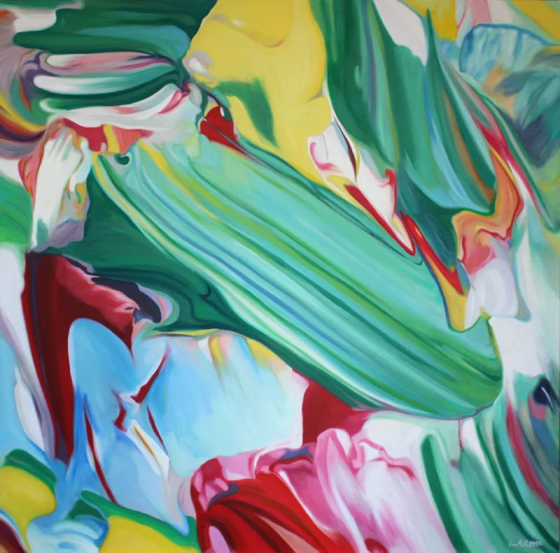 “繁花系列”创作始于2024年,艺术家在画布上重建一个“繁花盛开”的视觉宇宙。颜料被化作花瓣、叶片与光斑,在画面上恣意生长、碰撞、消融。看似随机的色块与线条,实则暗含东方水墨的留白智慧与西方抽象的韵律节奏,如同柏格森笔下“绵延”的具象化:每一朵花的绽放都是过去经验的累积,每一片花瓣的舒展都是对未来的期待。从《什么》到《繁花》,何俊艺完成了从“解构时间”到“重构生命”的升华。他不再执着于对抗时间的暴力,而是以艺术的方式证明:即便在机械复制的时代,生命依然能在色彩的呼吸与笔触的跃动中,抵达柏格森所说的“内在的绵延”——那里没有机械的切割,只有生生不息的创造与绽放。