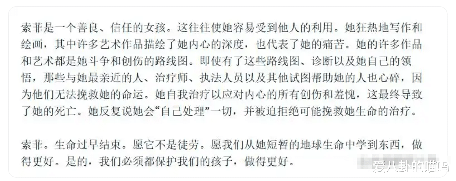 在苏菲的悲剧发生之后,她的家人和朋友也特别心痛,他们认为是因为自己没帮助苏菲,没有在她最难过的时候,能够帮助她,在导致了她的死亡。