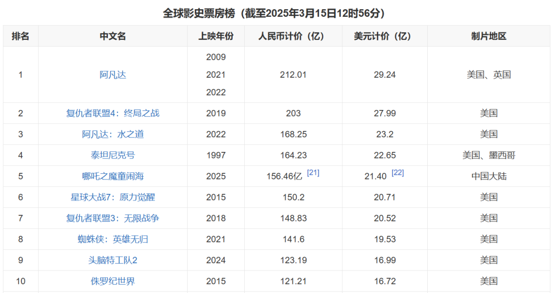 看看全球电影票房榜单,全球前五十,绝大多数都是美国制作(有几部是合拍)。要不是今年《哪吒2》杀出一条血路,冲到了目前榜单的历史第五(马上要超过第四的泰坦尼克号了),我国的电影全球榜单上估计是个零蛋,可见《哪吒2》这部电影的历史意义在哪了。