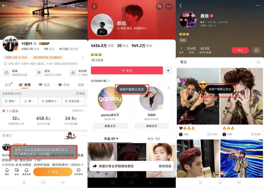 各大平台的账号都被禁止关注,已经被列入了风险艺人的行列。