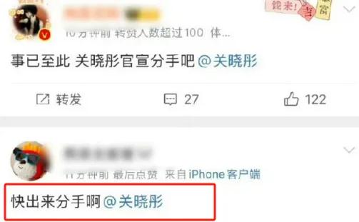 然后,关晓彤的评论区就被粉丝各种刷屏喊话分手。