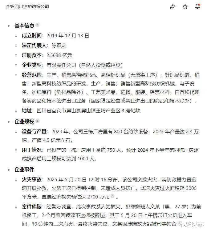 事发地是四川宜宾的屏山县,这家公司叫锦裕纺织,注册资本2.5个亿,在当地算大企业了。三栋厂房起火,750名工人,差点酿成大事故。