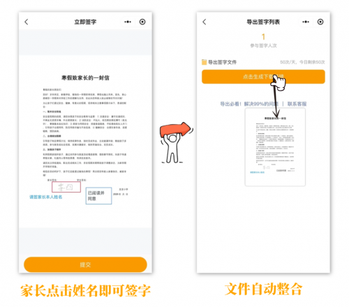 放假前必备的“致家长的一封信&安全告知书”签名收集,以前要让学生带回签字再回收,难免出现丢失、遗漏,整理起来还费劲。