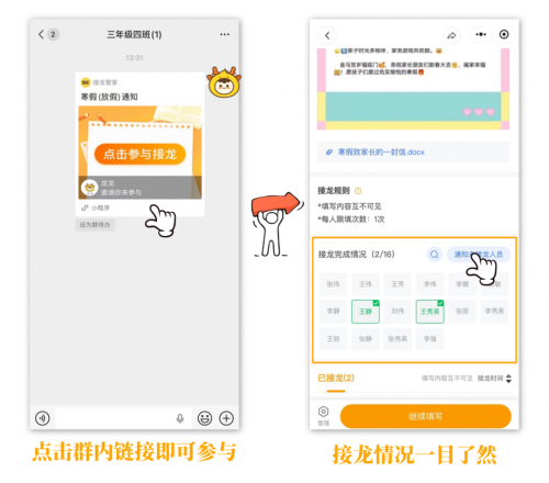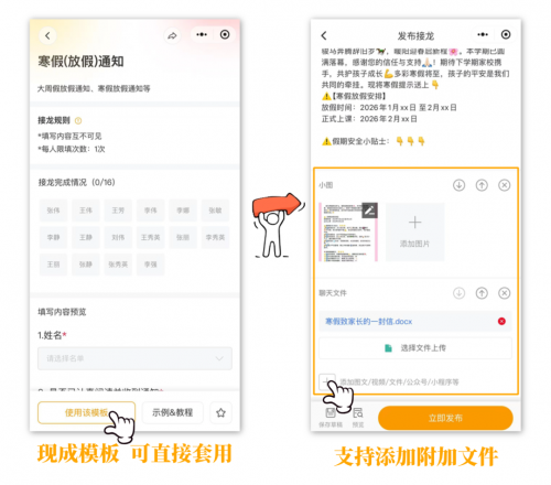从信息传达、签名收集、家长会签到到安排寒假作业打卡,全方位协助搞定期末收尾全流程,把老师从繁杂事务中解放出来~