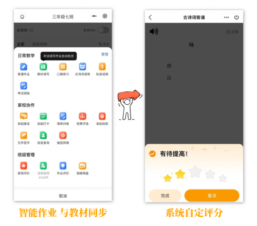 更有AI智能批改功能,听写、跟读、口算题、古诗词读背等作业自动判对错、评分;