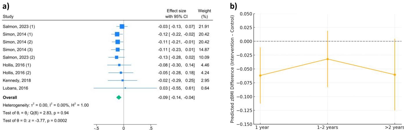 研究人员将多个高质量实验的数据合并后发现,通过身体活动干预,孩子的BMI(身体质量指数)确实下降了,平均下降了0.42 kg/m²。如果我们看更灵敏的指标——BMI z分数(消除了年龄性别影响的标准分),也有显著下降。