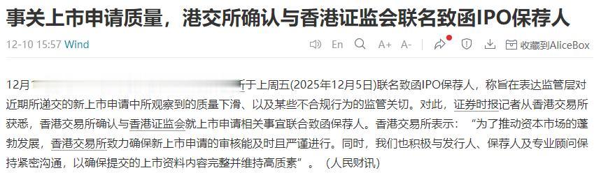 昨天有提到港股近期显著弱于A股,可能有IPO抽血太严重、外资对经济预期不高以及全球流动性回流美国等因素有关,在美联储议息会议前一天,港股终于有止跌迹象,港股这里其实是回调比较充分的。 刚好看到一则报道,市场有传闻称,香港证监会、港交所于上周五(2025年12月5日)联名致函IPO保荐人,称旨在表达监管层对近期所递交的新上市申请中所观察到的质量下滑、以及某些不合规行为的监管关切。