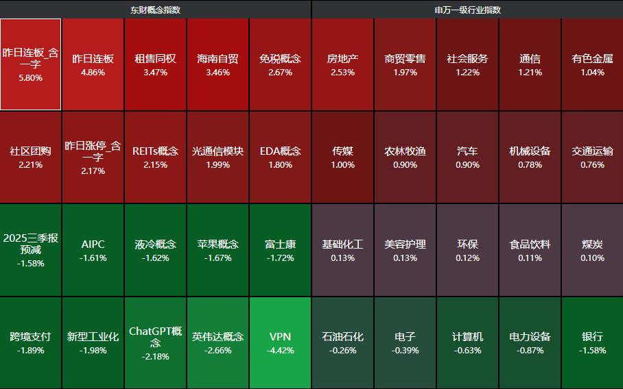 分行业来看,房地产、商贸零售、社会服务、通信、有色金属等行业领涨,银行、电力设备、计算机等行业领跌。