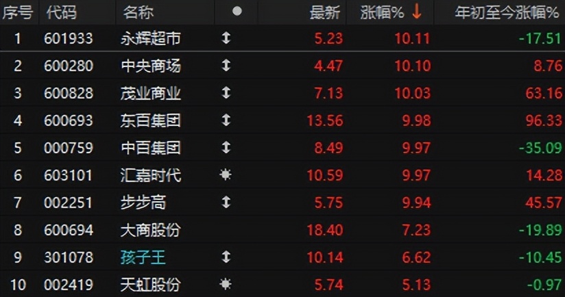 A股商超板块走强,永辉超市、中央商场、东百集团、中百集团等多股涨停。