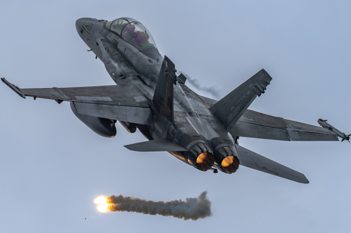 F/A-18绰号“杀人蜂”,配属AIM-120中程空对空导弹、AIM-9X “响尾蛇”近距格斗导弹,如果在静默锁定且近距离开火的条件下,F-15E被咬住后根本来不及躲避,飞行员唯一的求生办法只能是跳伞。