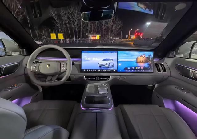 深蓝S09的内饰设计颇具科技感,中控台采用简洁的直线条造型,最引人注目的是悬浮式的双联屏,它横跨中控和副驾驶区域。与HUD抬头显示系统相结合,形成了三屏联动的视觉效果。方向盘采用运动风格的平底设计,与传统车型不同的是,它并没有配备常规的仪表盘。这款车还配备了电子怀挡,进一步提升了操作便利性。为了营造更高级的氛围,设计师在中控台和门板内侧巧妙地融入了氛围灯,整体质感相当出色。