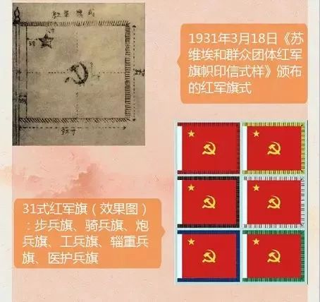 1931年3月18日,中华苏维埃中央革命军事委员会颁布《苏维埃和群众团体红军旗帜印信式样》,红军军旗以旗须颜色区分兵种:红色——步兵、黄色——骑兵、黑色——炮兵、白色——工兵、蓝色——辎兵、绿色——医护兵。