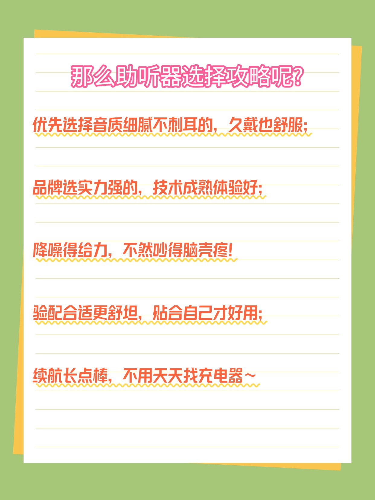 那么助听器选择攻略呢?优先选择音质细腻不刺耳的,久戴也舒服;品牌选实力强的,技术成熟体验好;降噪得给力,不然吵得脑壳疼!验配合适更舒坦,贴合自己才好用;续航长点棒,不用天天找充电器~接下来跟大家分享几款热门助听器测评