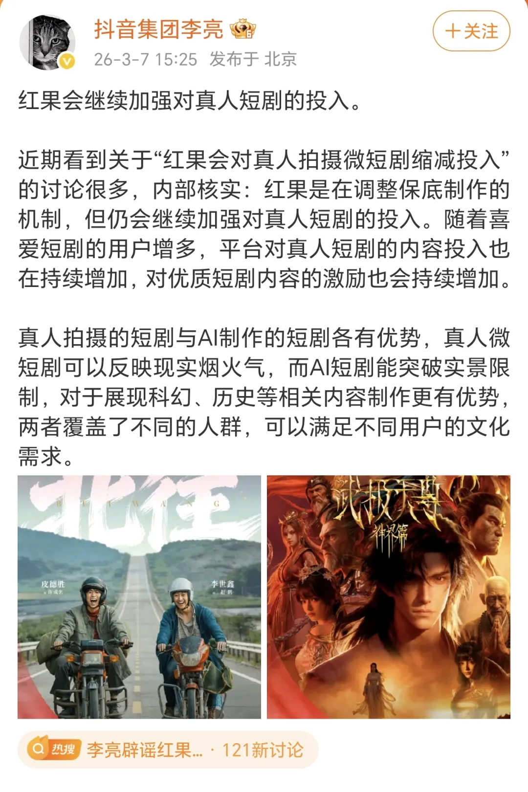 抖音集团副总裁李亮于昨天在微博进行回应,表示红果仍将继续加强对真人短剧的投入,真人短剧和AI漫剧各有优势,算是对这则传闻给予了官方回应。