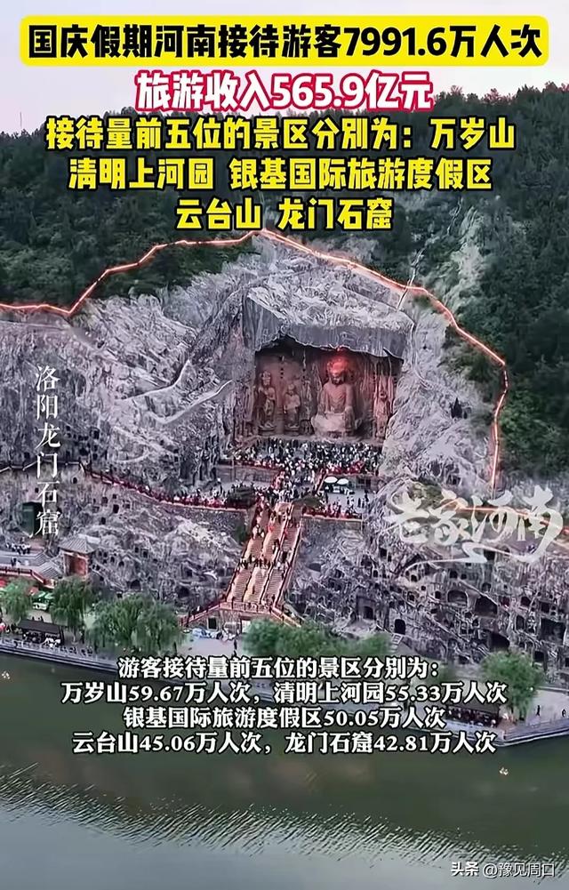 假期期间河南共接待游客7991.6万人次,旅游收入565.9亿元,与2023年国庆假期相比,接待人次增长5.1%,旅游收入增长高达15.5%。