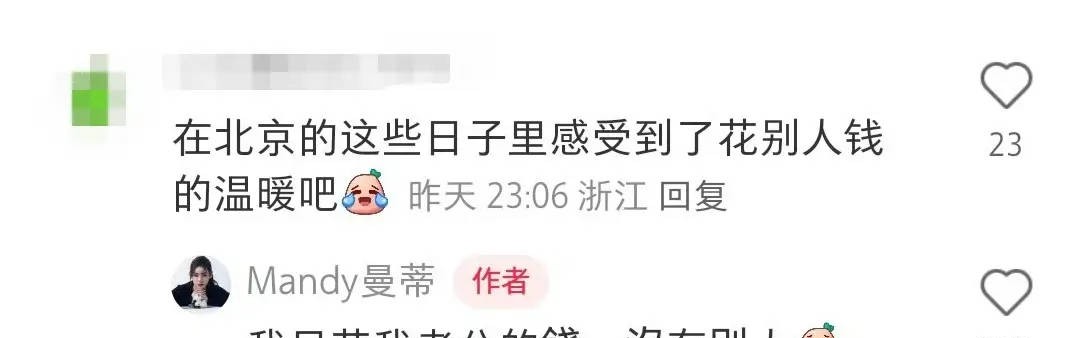 不过,随着Mandy的分享,网络上关于她生活方式的质疑声不绝于耳。有网友直接指出,她在北京的一切消费和挥霍,靠的似乎都是“别人的钱”。这让原本愉悦的气氛瞬间变得紧张。这种质疑声如同平静湖面上的一颗石子,引发一圈圈涟漪,冲击着Mandy的心灵。