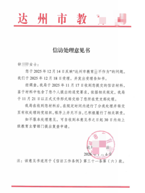 反映情况遇阻,教育部门调查疑点丛生2025 年 11 月 17 日,不堪其扰的钟女士向达州市教育部门提交了完整的反映材料,希望能通过正规渠道维护自身权益,却不料这段维权之路却布满波折。但钟女士提交材料后,长期未收到明确回应,直至12月16日,在上级部门的介入推动下,达州市教育部门才与她进行谈话。