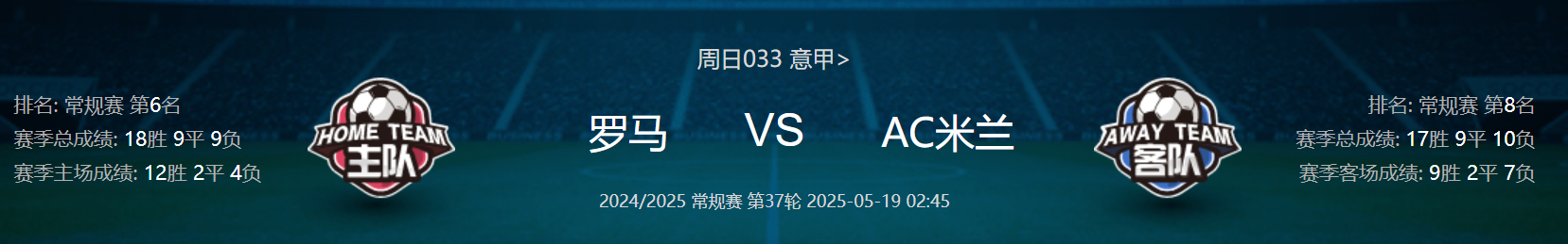 这场赛事为意大利甲级联赛的一场对决,由罗马坐镇主场迎战 AC 米兰。近期罗马在联赛中的表现不尽如人意,过去三场比赛仅取得一胜两负的战绩。在最近一场联赛中,罗马客场作战,上半场与亚特兰大战成 1:1 平局,进入中场休息。然而下半场风云突变,罗马防线失守,再丢一球,最终以 1:2 的比分败北。目前,罗马在意大利甲级联赛积分榜上位居第 6 名。