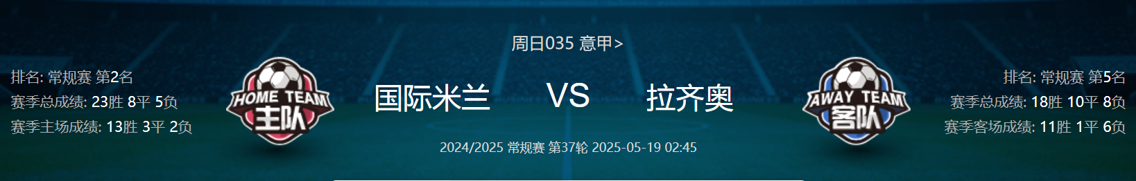 此役为意大利甲级联赛的一场焦点对决,由国际米兰坐镇主场迎战拉齐奥。回顾国际米兰近三场比赛的表现,他们取得了两胜一负的战绩,状态可圈可点。上一轮联赛,国际米兰在客场以 2:0 的比分干净利落地战胜都灵,上下半场各入一球,整场比赛球队发挥稳健,展现出强大的实力。目前,国际米兰在联赛积分榜上稳居第二位,对于本赛季联赛冠军的争夺,他们无疑抱有极大的期望,因此这场比赛的取胜决心毋庸置疑。