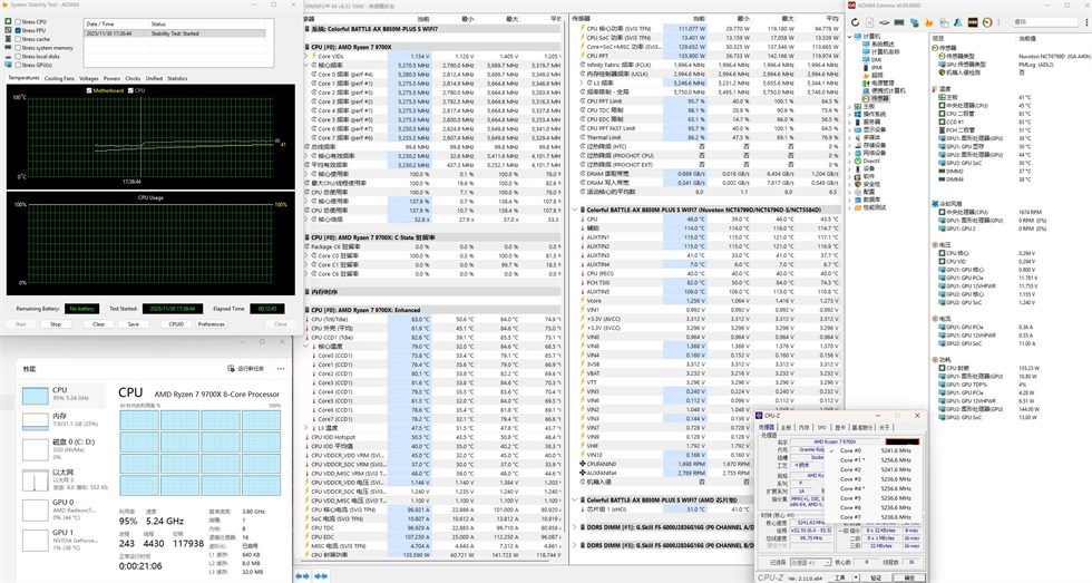 室温26℃,PBO拉满,单烤FPU,跑了10分钟温度稳定——CPU温度83℃、CPU核心82.6℃、CPU封装81.9℃,CPU功耗稳定在135W左右,频率全核5250MHz左右。