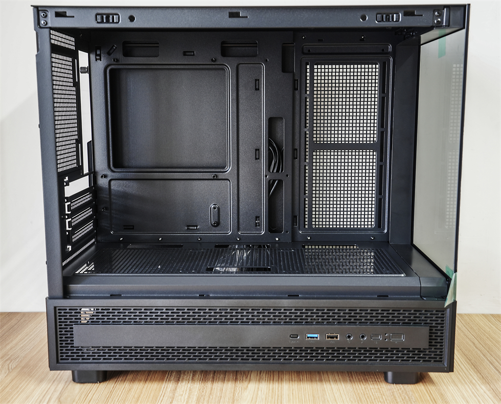 正面内部结构来一张, Tt钢影透S-M PRO机箱最大支持到M-ATX主板,顶部支持120mm×3或140mm×2风扇,侧面支持2×120mm风扇,电源仓上方支持3×120mm风扇,加上菊花位120mm风扇,最多可以安装9风扇。