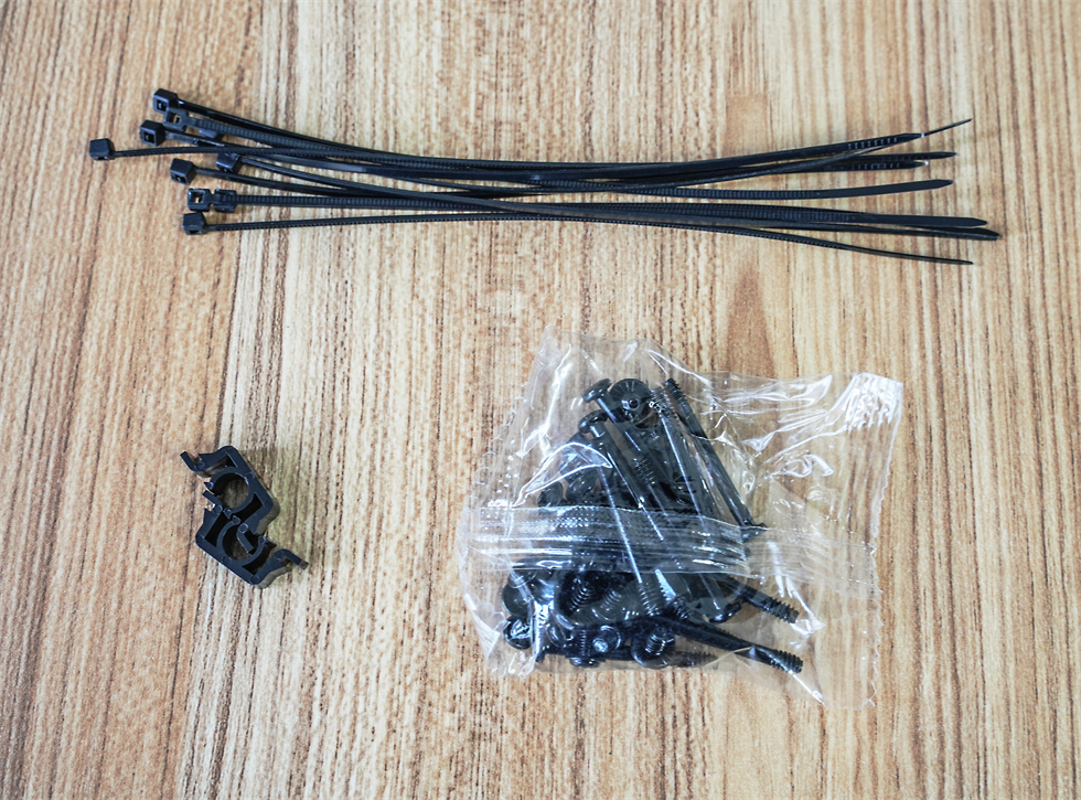 附件包括说明书、一袋各种安装螺丝、扎线带、挡板固定扣。四角均有支撑脚。