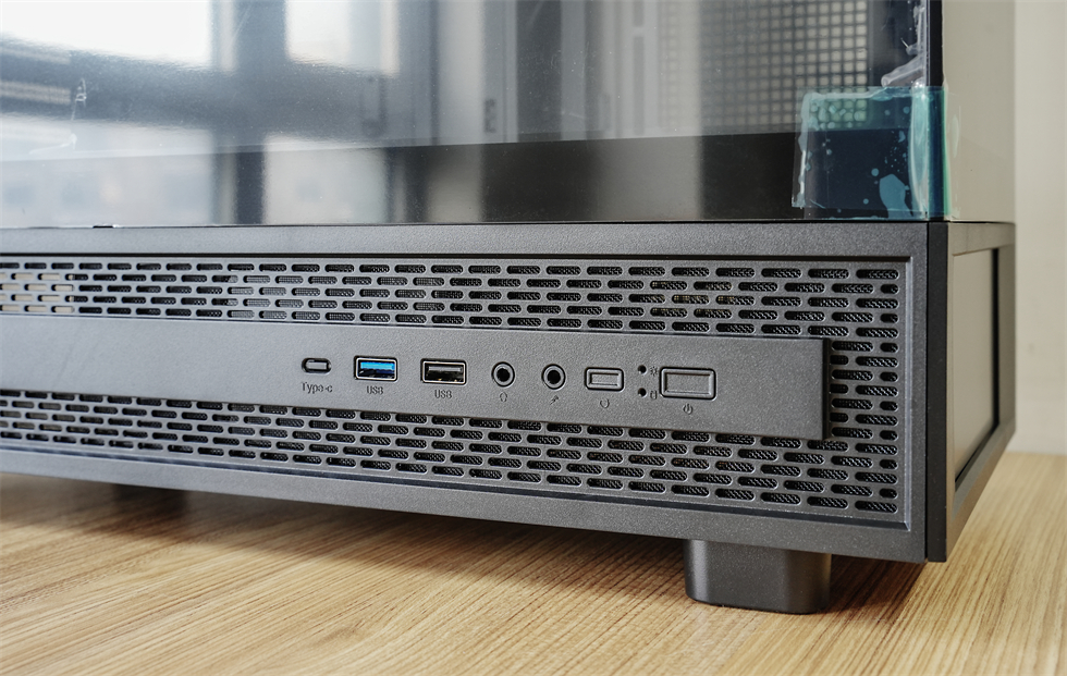 IO区在机箱侧面,由左至右依次为2×USB Type-A、音频输出接口、麦克风接口、重启按钮、电源开关。