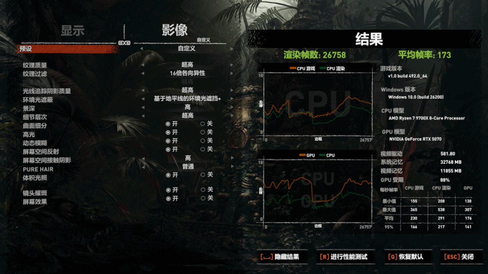 《黑神话:悟空》,2K分辨率,设置具体如上图,大部分是超高,开启DLSS,开启全景光线追踪:中,关闭帧生成,平均帧率65帧/秒;开启帧生成,平均帧率106。古墓丽影:暗影,2K分辨率,设置如上,平均帧率173。