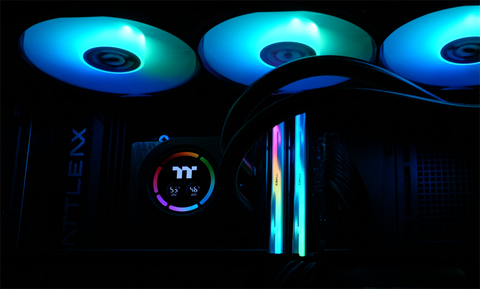 Thermaltake(Tt)的钢影·木语360一体式CPU水冷冷头可以显示CPU和GPU的实时温度。