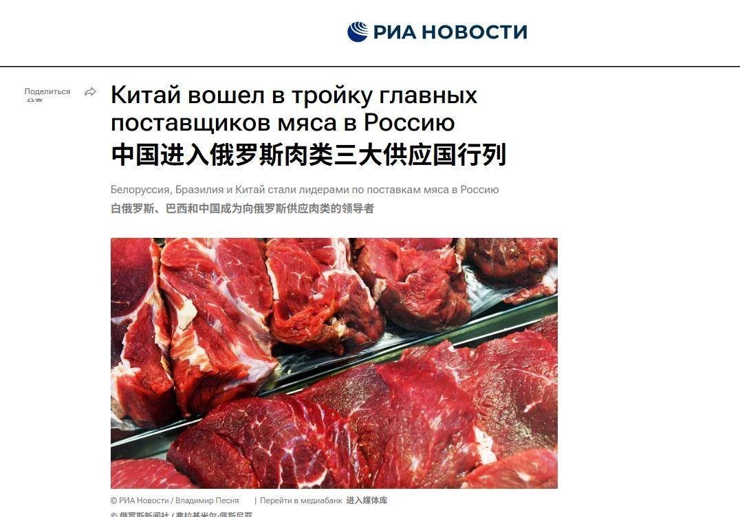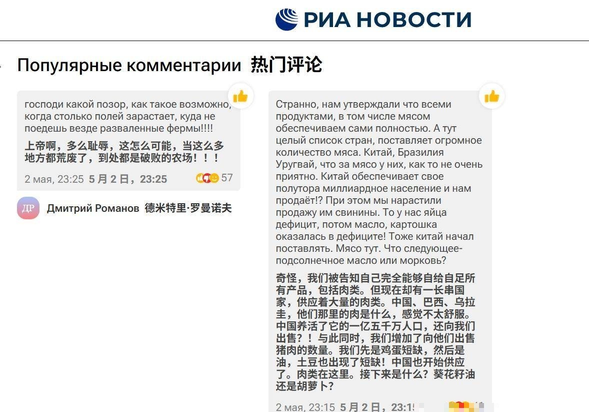 面对这一消息,俄新社评论区的网民情绪与土豆话题类似,纷纷表达“耻辱”和“丢脸”的情绪。其中一条典型评论写道:“真是奇怪,官方明明说我们食品完全自给自足,包括肉类。结果现在却依赖一大堆国家进口肉类——中国、巴西、乌拉圭……他们的肉到底靠不靠谱?中国有15亿人口,居然还能卖肉给我们!更讽刺的是,我们还在加大对他们的猪肉出口!先是蛋荒,接着黄油短缺,现在连土豆都紧缺,中国又来补缺。肉类也这样,下一步会断供什么?葵花籽油还是胡萝卜?”