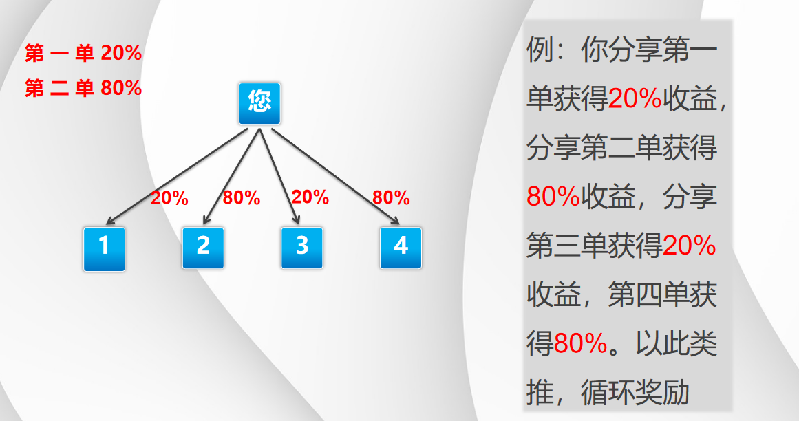 采用独特的20%-80%循环交替奖励:第1单奖20%,第2单奖80%,第3单再回20%……不断循环。这种波动设计,持续创造惊喜感,让推广动力不断。