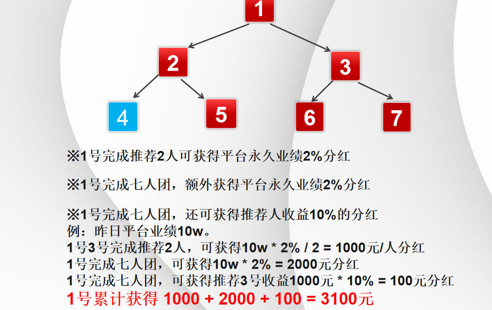 用户A推荐了B、C,成功成组,获得小组分红:10万 × 2% ÷ 2 =1000元。