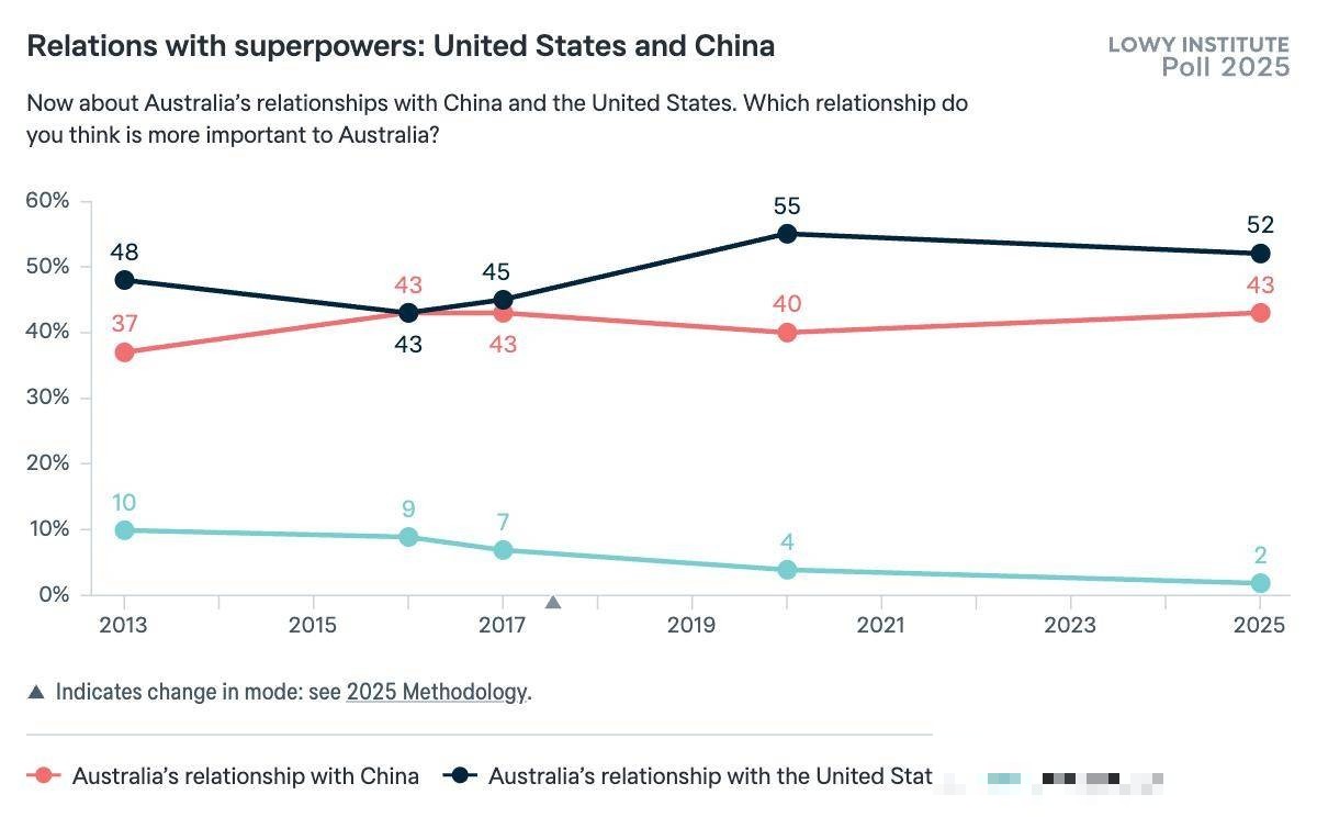 特朗普时期的极端政策,加上他对全球盟友的忽视,彻底破坏了美国的国际形象。在全球贸易战和关税战中,特朗普无所不用其极,甚至在乌克兰问题上背弃北约盟友,而在中东问题上则大力支持以色列,这让美国的信誉在全球范围内大打折扣。根据“洛伊研究院”的调查显示,2020年时,55%的澳大利亚人认为美国比中国更重要,而到2025年这一比例已降至52%;而认为中国更重要的人数从40%增至43%。此外,关于“中国是澳大利亚的经济伙伴还是安全威胁”的调查显示,50%的受访者认为中国是经济伙伴,47%认为中国是安全威胁,显示出澳大利亚民众对中国的认知发生了变化。