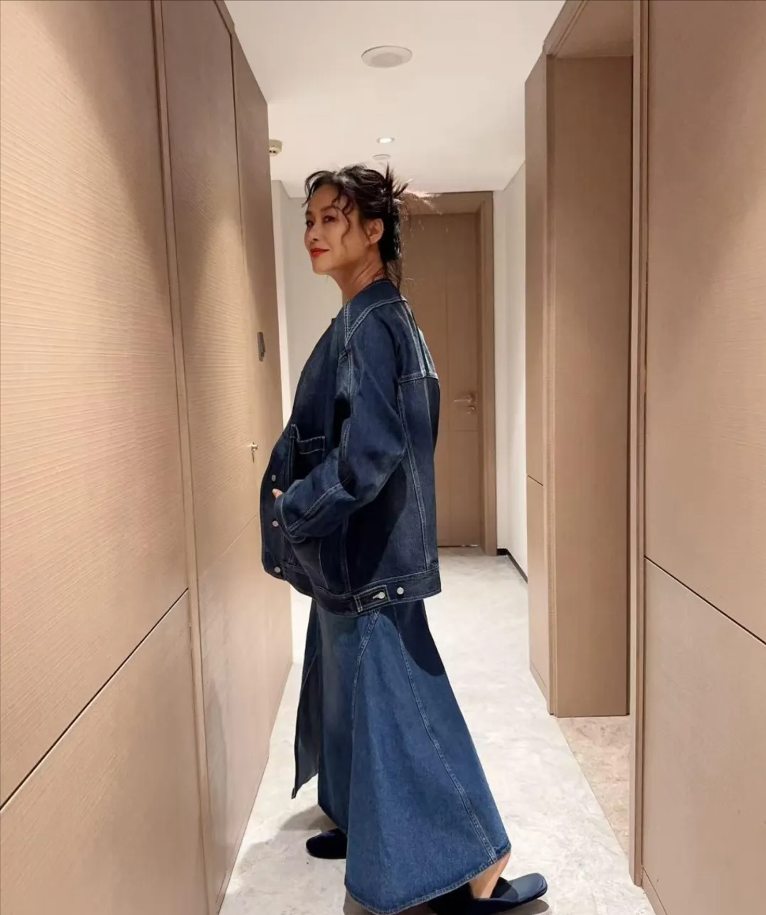 从脸型上来说,邬君梅属于长脸,把头发全部扎起来,露脸穿搭会更显气质感!当头发扎成高扎丸子头,两侧的龙须刘海,不仅起到修饰脸型的作用,还会让整体造型显得减龄。私下里的邬君梅穿牛仔套装,搭配蓬松的盘发造型,这样既能突出脸型的精致,又能起到减龄的效果。