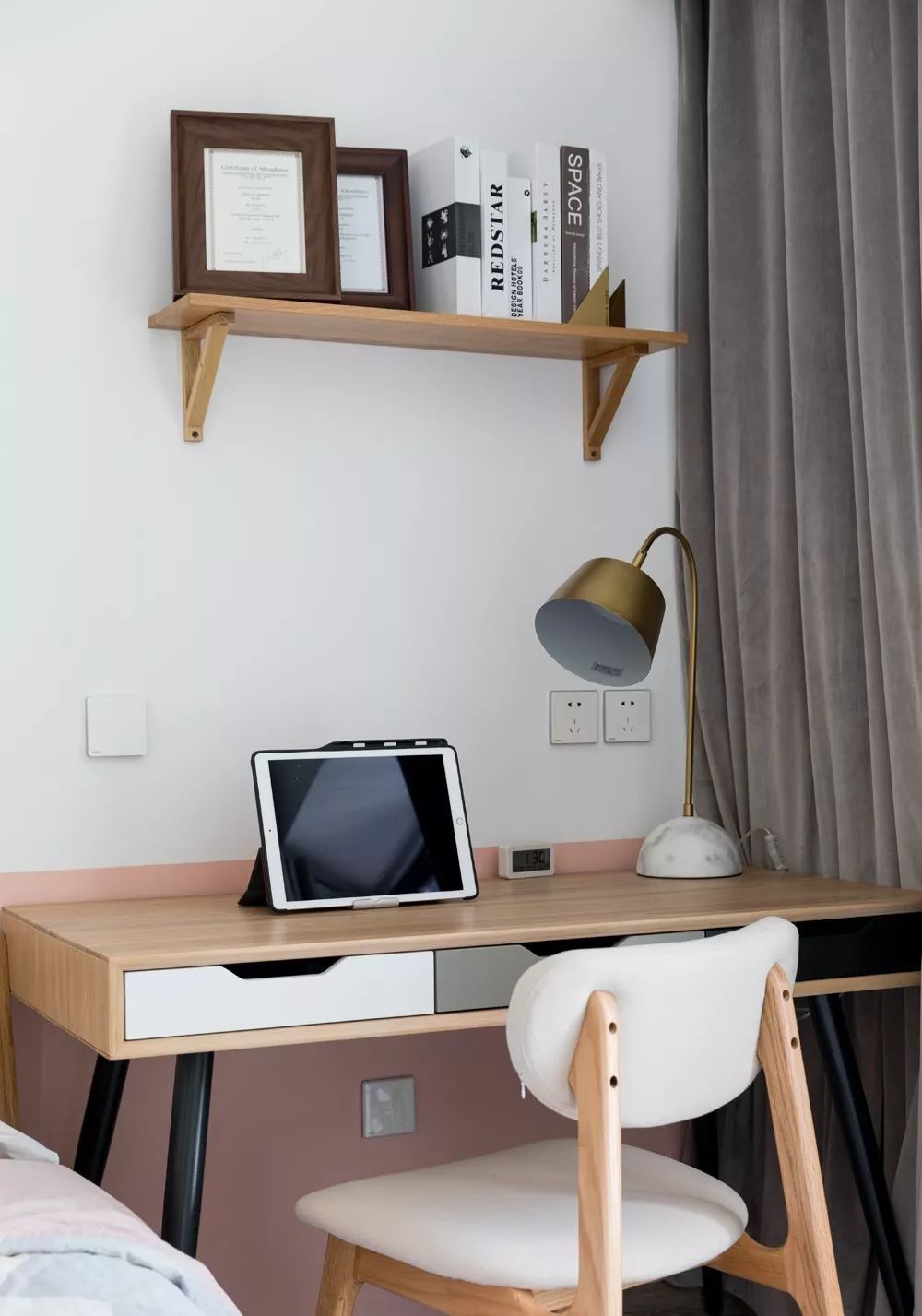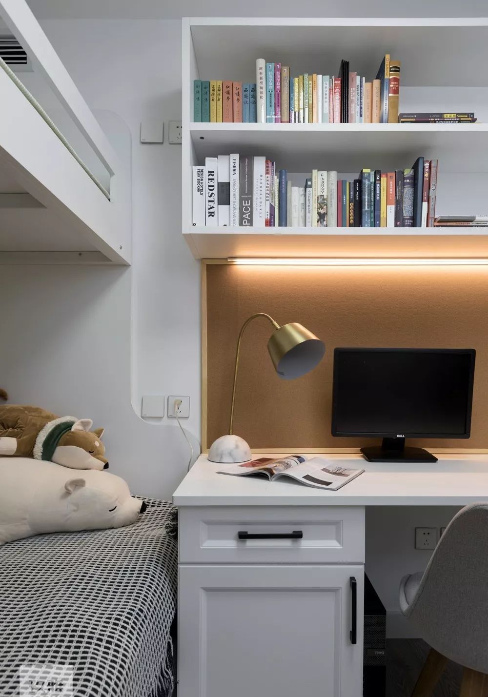 4、女业主有很多书,设计师在客厅一侧做了30cm厚的一排书柜,次卧的办公桌上面也有一排书架。