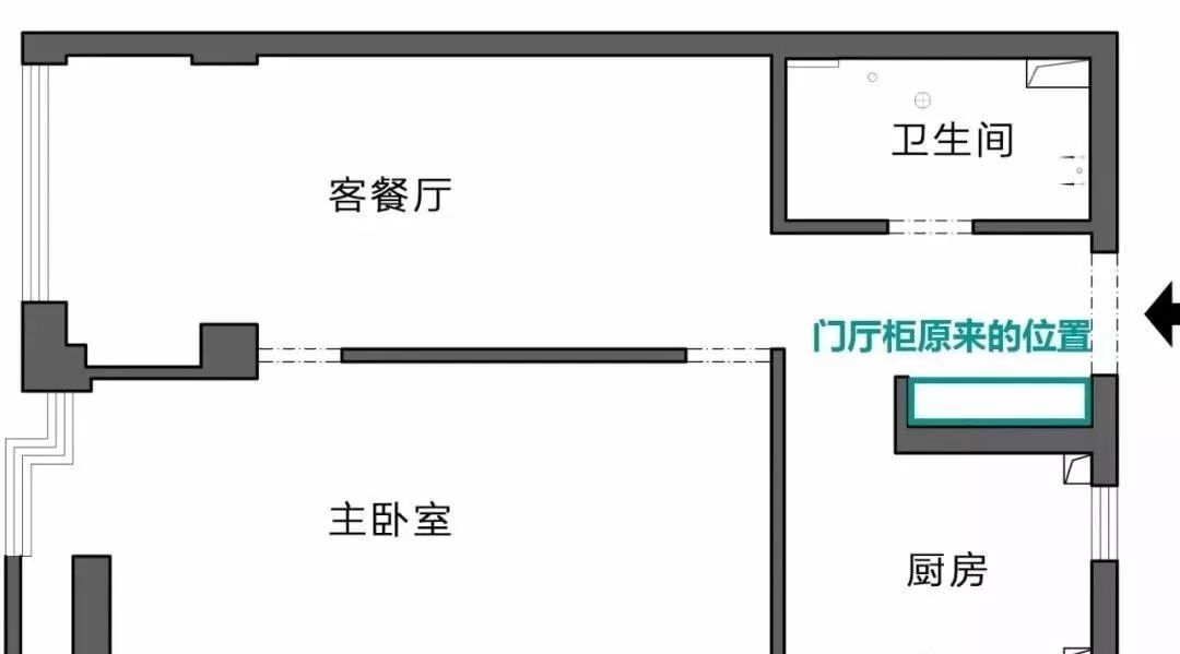 1、把门厅柜位置从厨房门口改到了卫生间门口,在不影响卫生间使用的同时,还换来了一个开放式的餐厨空间。