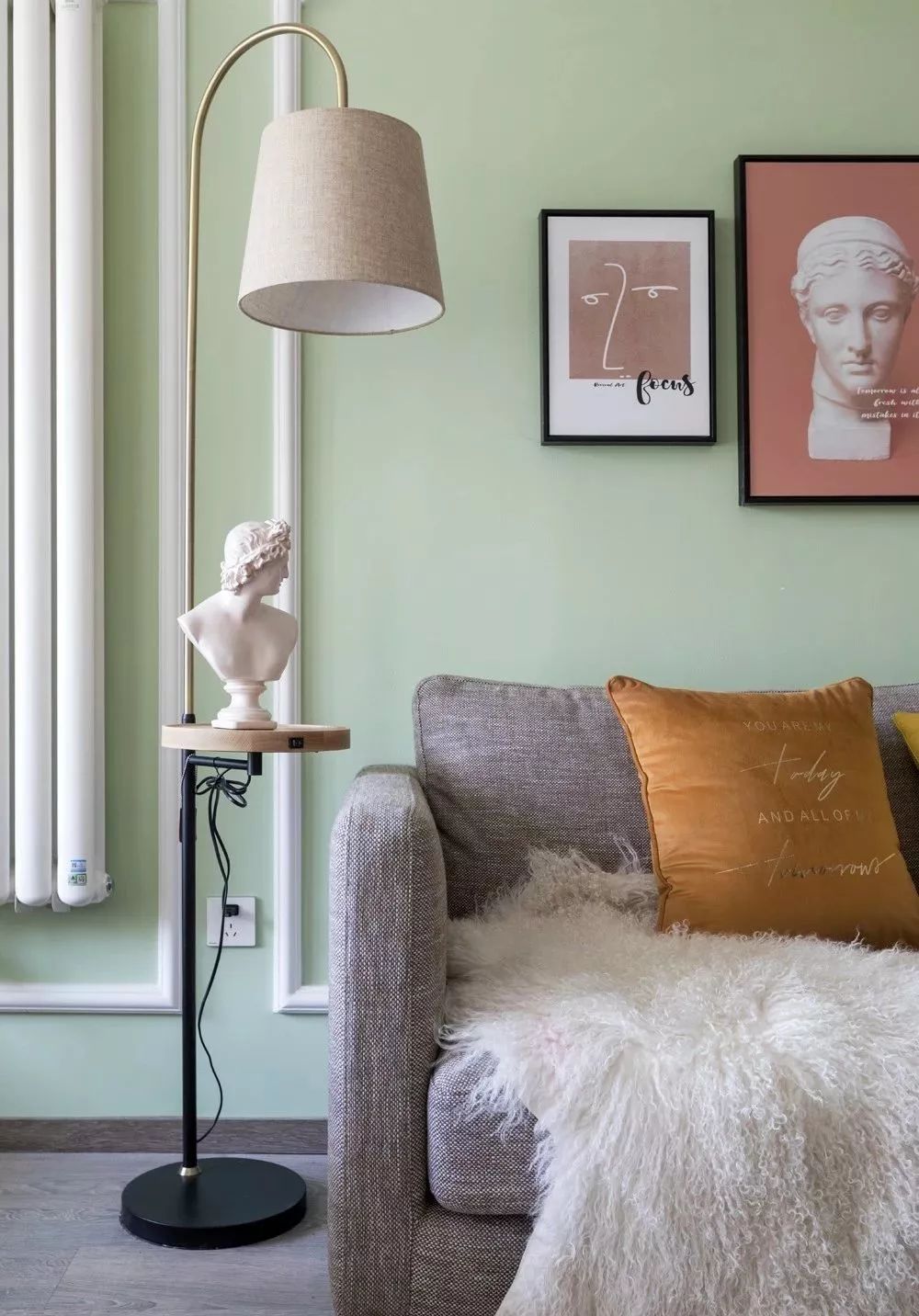 浅绿色的背景墙搭配白色石膏线,造型很简约,整体有点简美小清新的感觉。