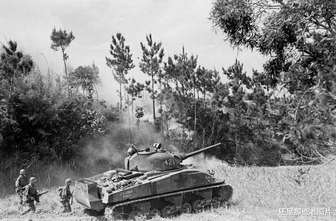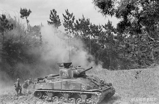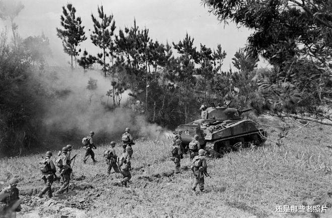 1945年4月,在冲绳岛的战斗中,在美军M4谢尔曼中型坦克的率领下,美军向前发起了冲击。