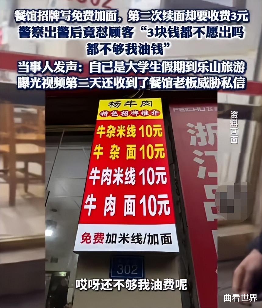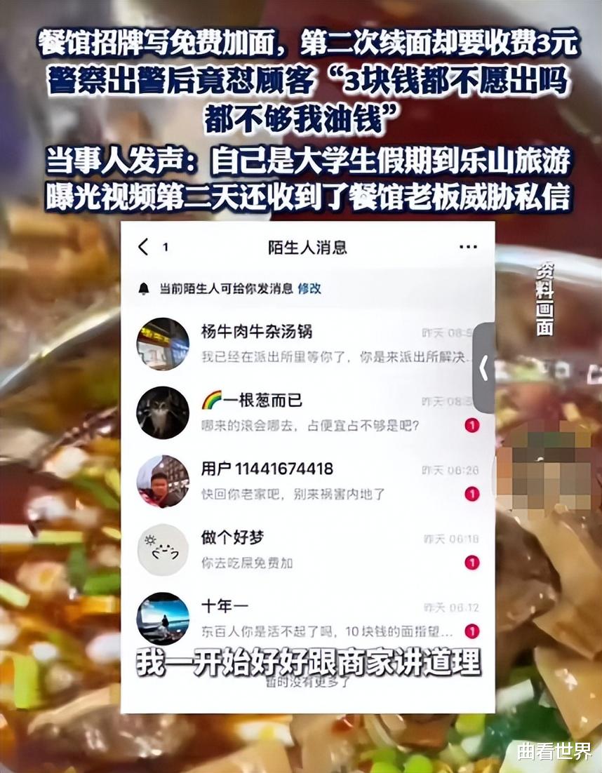 一句 “三块钱都不愿意出,过来一趟还不够我的油费”,竟让四川乐山文旅一年的努力付诸东流。事情的起因是一位来自辽宁的大学生,跨越千里来到四川乐山旅游。当晚他走进了夹江某面馆,店前大学生清晰地看到店门口写着 “免费加米线加面” 的招牌。