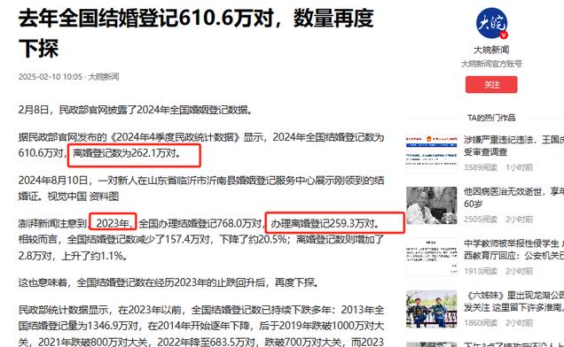 信息来源:大皖新闻 2025-2-10 去年全国结婚登记610.6万对,数量再度下探